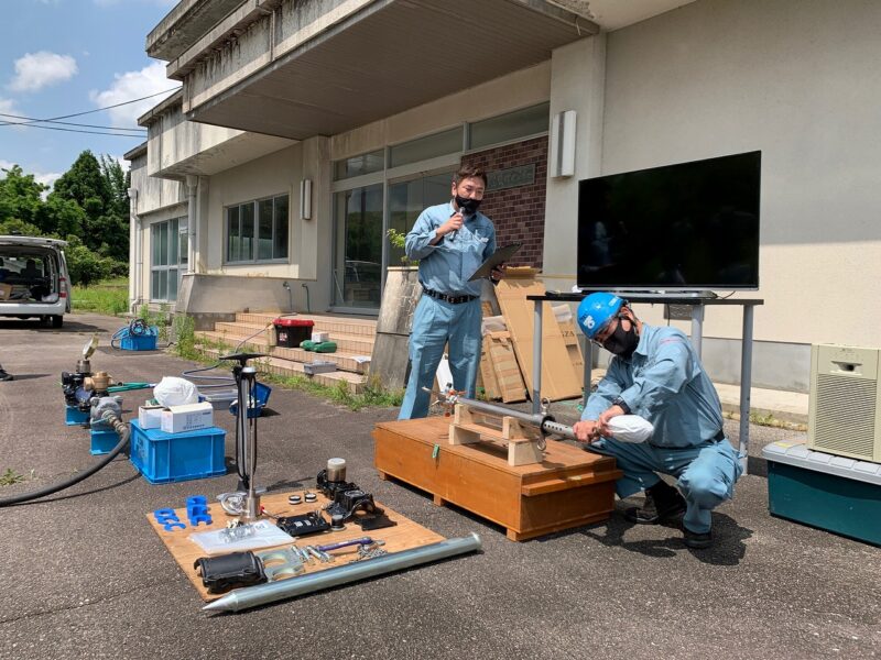 2021.05.25 2021年 エアープラグ講習会の開催 令和3年5月25日、大西浄水場にてエアープラグ講習会を開催しました。 水道管内に不断水で機械的に挿入したエアープラグを、空気で加圧・膨張させ簡易的な止水…